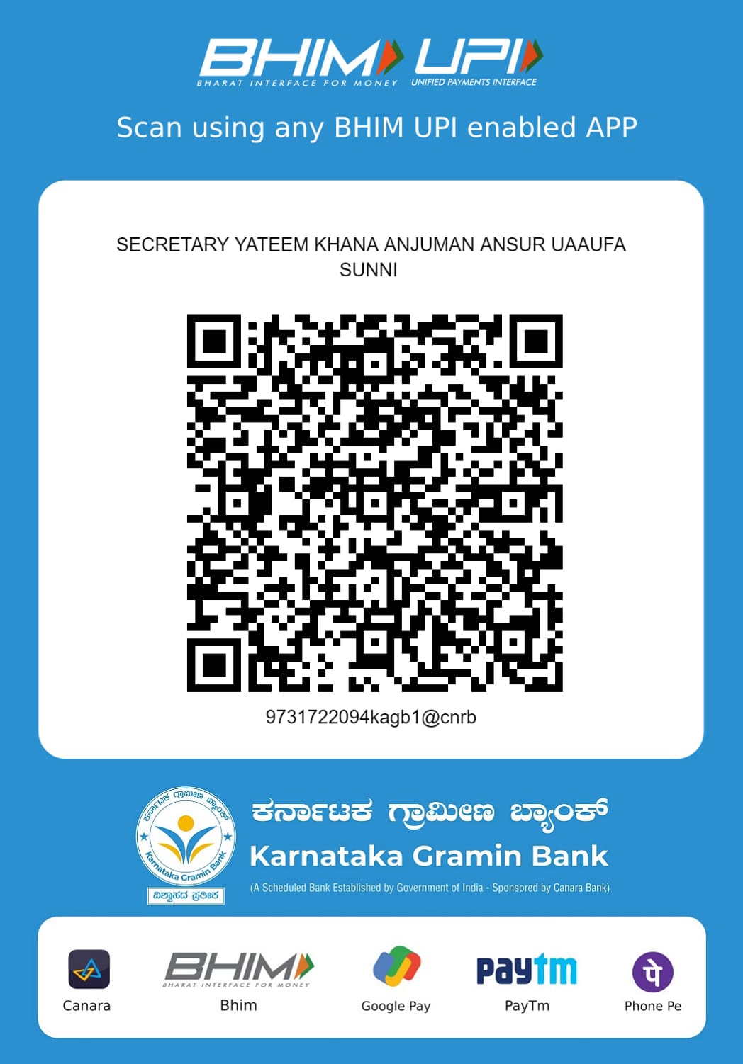 Cheques / Postal orders in favour of “Secretary Yateem Khana”, payable at Kalaburagi.